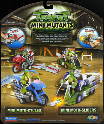 Mini Mutant Turtles + stunt ridin’ battle vehicles = Maximum ninja action! Set the turtle in the saddle, pullback the vehicle, press the activation button, and rip wild stunts as you race into battle, Ninja Turtle-style!