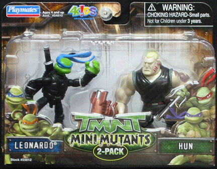 TMNT MINI-MUTANTS 2-PACK LEONARDO vs. HUN Mini-mutant ninjas for maximum banzai action! Combine them with one of four TMNT Mini Action Playsets or take ’em everywhere you go for pocket-sized bushido brawls! © 2007 Playmates Toys